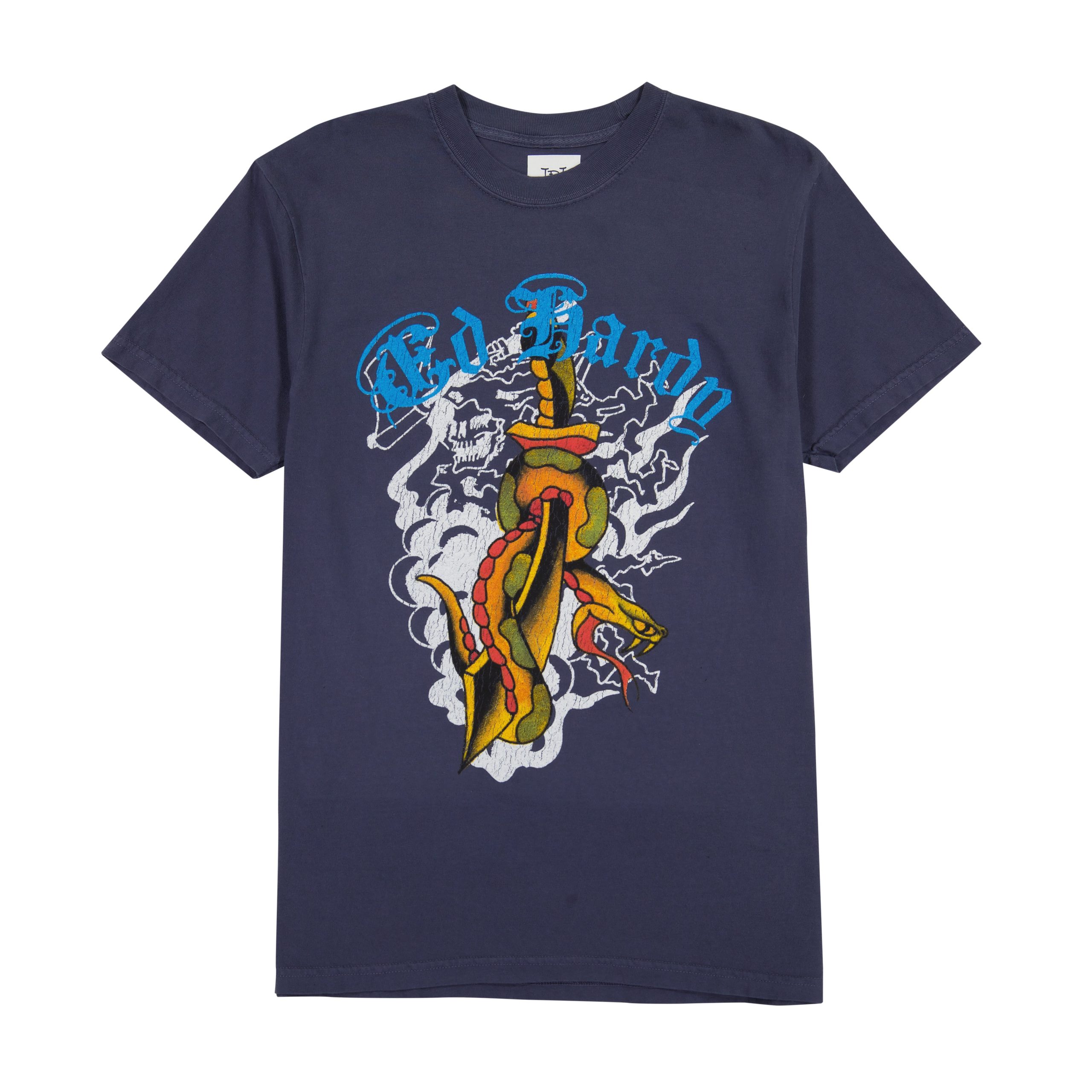 100% cotton tee treated with a garment wash to evoke a vintage feel. Complete with archival Ed Hardy logos and dagger snake graphic.