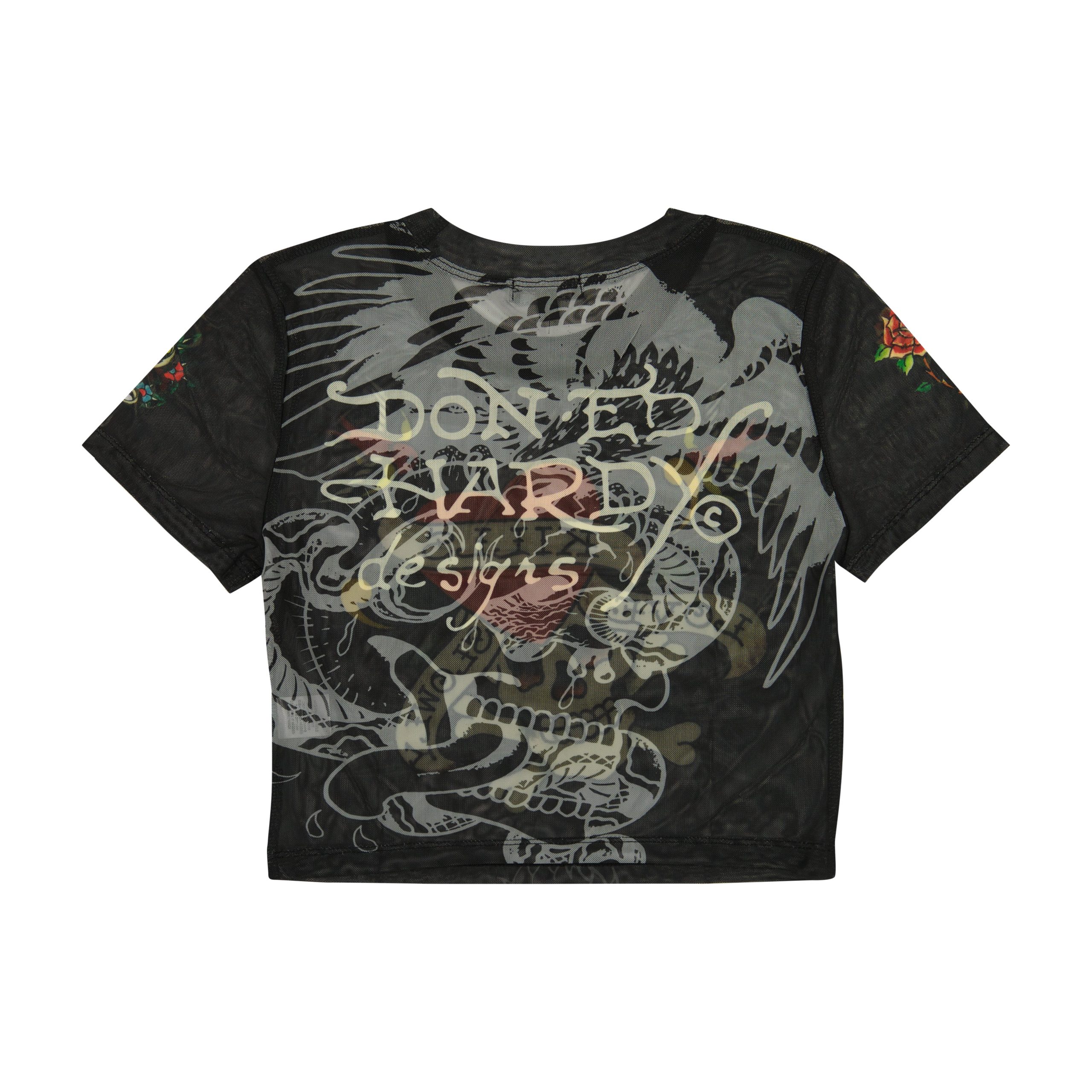 Signature baby tee silhouette cut from a power mesh. Features layers of archival Ed Hardy artwork and logos and complete with a Love Kills Slowly skull graphic.