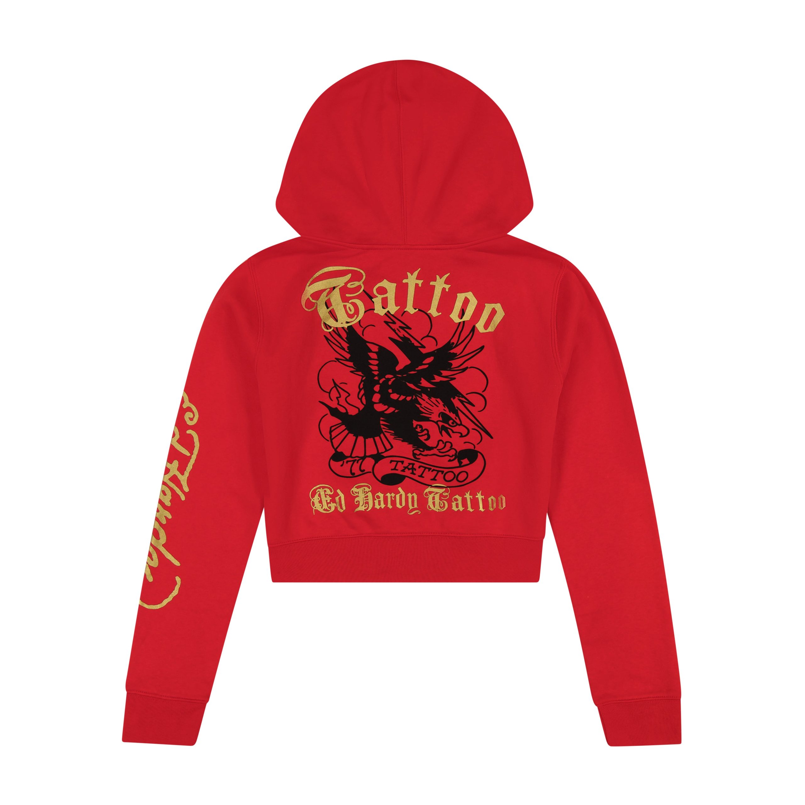 Ed Hardy’s fleece sets add a modern twist to the styles that reigned in the early 2000’s. This?cherry red sweatshirt features a cropped fit complete with multiple signature graphics and a gold logo.?