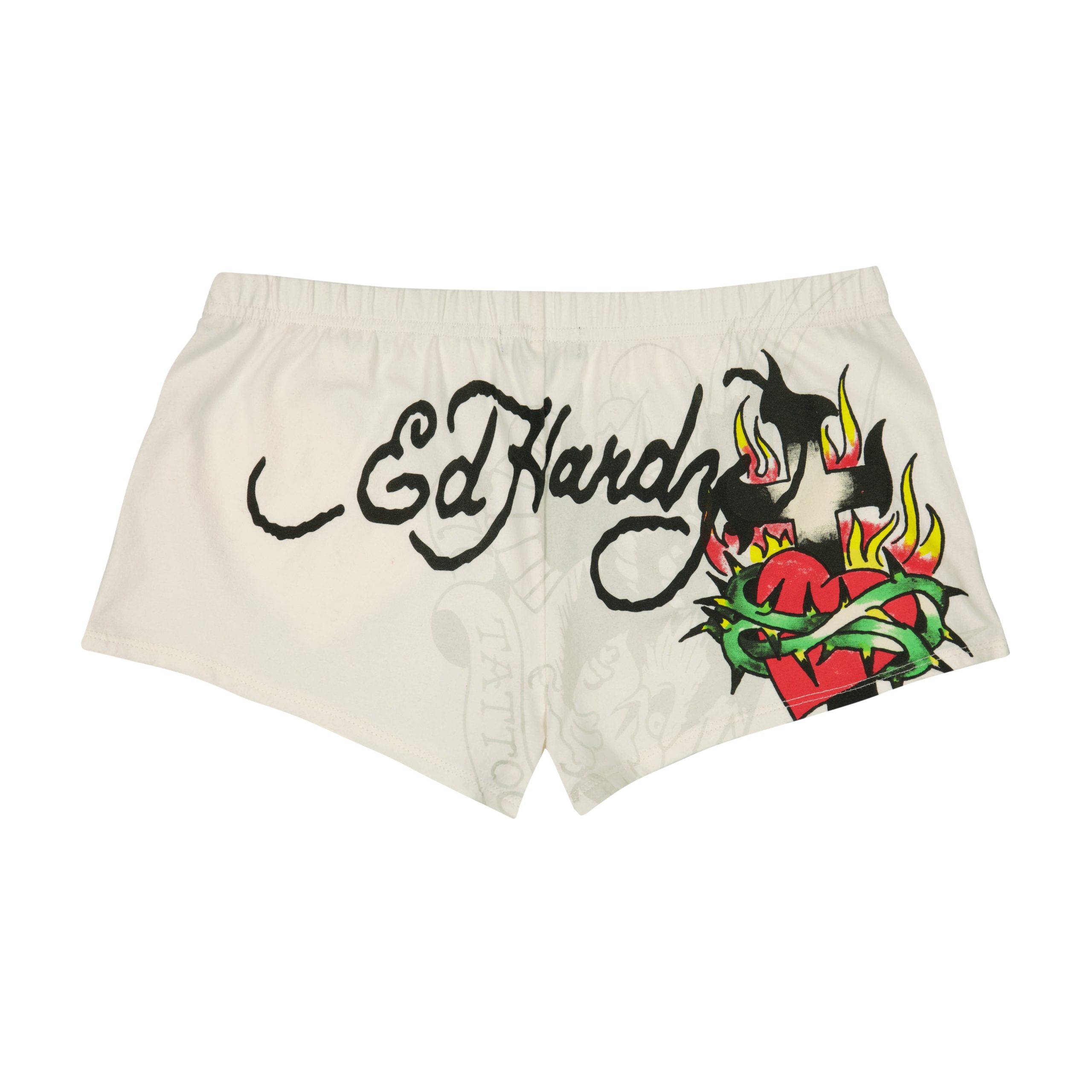Mini biker shorts constructed from an ivory cotton blend. Features layered archival Ed Hardy graphics and multiple signature logos. Pair with our Cross Heart Tube Top ?to complete your look.