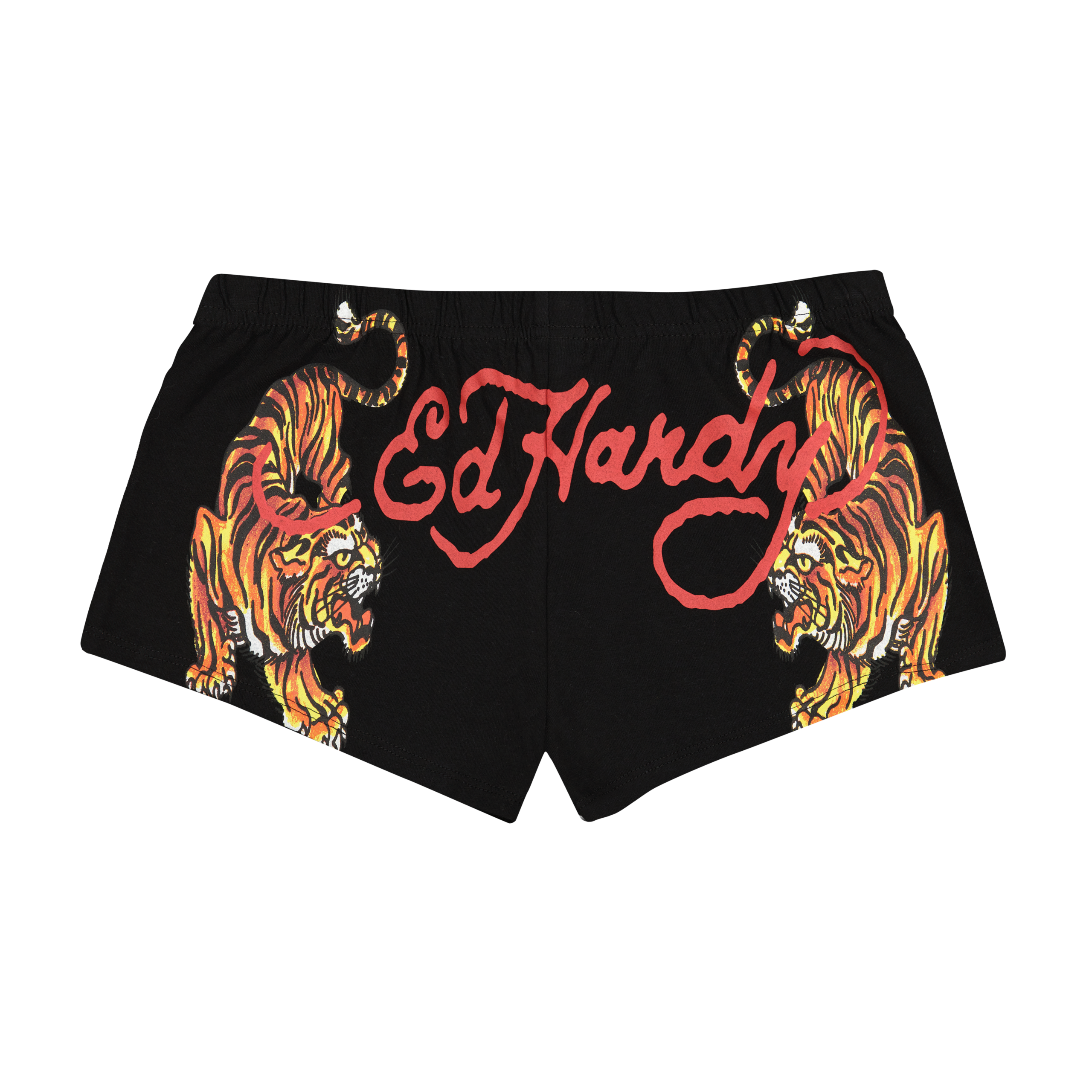 Mini biker shorts constructed from an ivory cotton blend. Features layered archival Ed Hardy graphics and multiple signature logos. Pair with our Tigers Tube Top to complete your look.